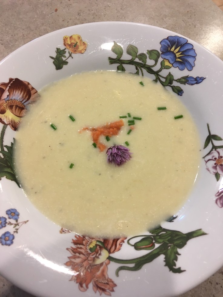 We take turns hosting but almost always follow the same routine. Guests congregate around noon and we enjoy three courses. The first course is the hor d’œuvre or entrée course and usually includes nuts, olives, radishes in salt and butter (a traditional French dish) and a glass of rosé or cava. This course can also include soup.