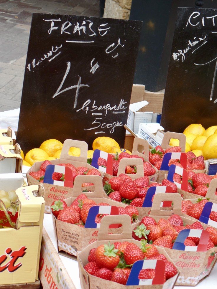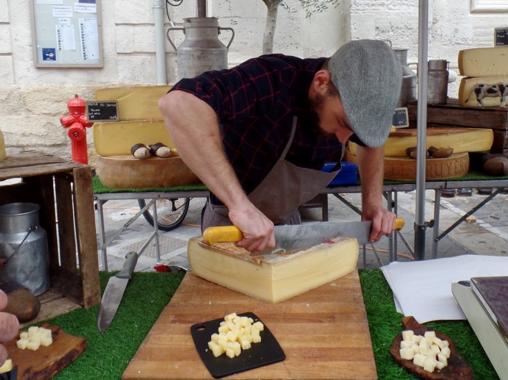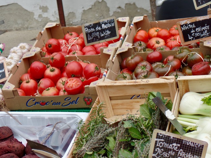 On our first of many subsequent visits to Isle, we stayed in La Maison sur la Sorgue, a small hotel owned by a wonderful couple who left Paris years ago to begin this fabulous venture in Provence. This has become “our place” a refuge of peace and quiet and cooing doves in the center of town. At breakfast on our very first morning we enjoyed goat cheese melted on a fig–unique and delicious. “Where did you find such fresh cheese?” we asked, and the answer was, “…right outside the door early this morning.” We didn’t recall shops outside the hotel door, so peeked out…and saw a cheese vendor directly outside the hotel door as well as many other vendors and shoppers spilling up and down the street and beyond. It was all color and sound and smells and things to buy. It was Market Day; our very first of many yet to come.