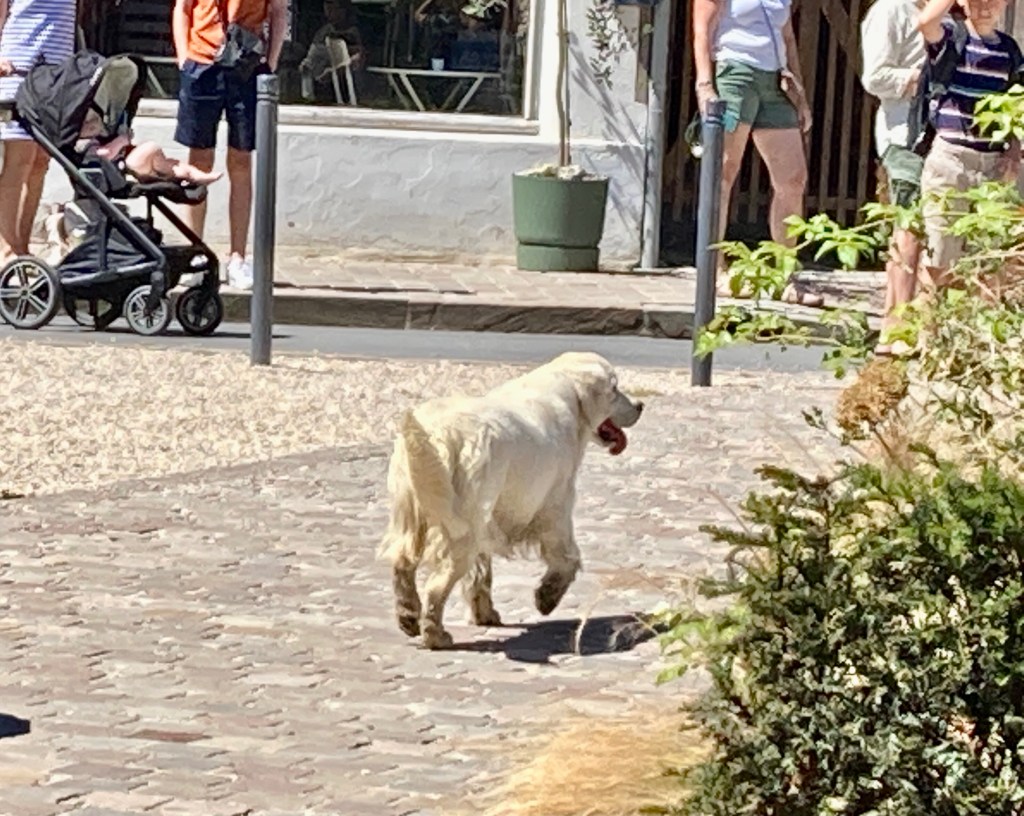 I was so impressed how the restaurant employees burst into action to help this wandering canine! The server called another server to bring some water, (it was a hot day) and she immediately got on the phone to the gendarmarie. The dog was quite agitated and would have nothing to do with the water, even though she was panting heavily, and wandered several times into the street, much to the horror of the restaurant customers.