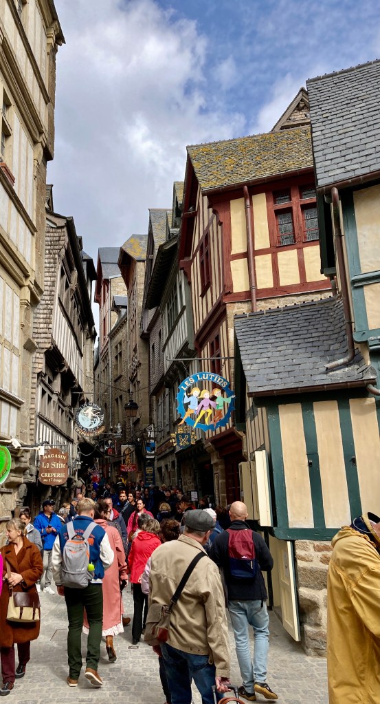 Our first visit to Le Mont-Saint-Michel was in March 2020, right before the world shut down due to COVID. Because of that, the village was mostly empty; a rare occurence. Fast forward two and a half years to our second visit when the world had returned to (a new) normal, and the village was once again packed with visitors – literally shoulder to shoulder, as you can see in the photos below.