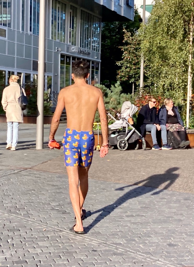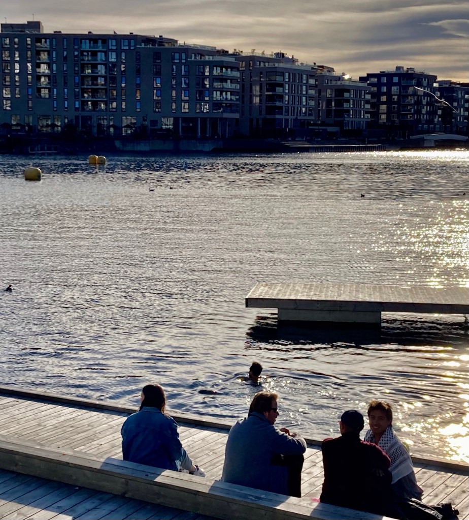 Tim and Lisa had spent a few weeks in the northern part of Norway before meeting up with us. Oslo was much warmer than where they had been, but still quite chilly; averaging around 45 – 50 F (8 – 10 C). At one point Lisa commented that she could walk down the street in her bathing suit since it was so much warmer than the north. After lunch one day, we saw this young man doing just that; he even went for a swim in the harbor!