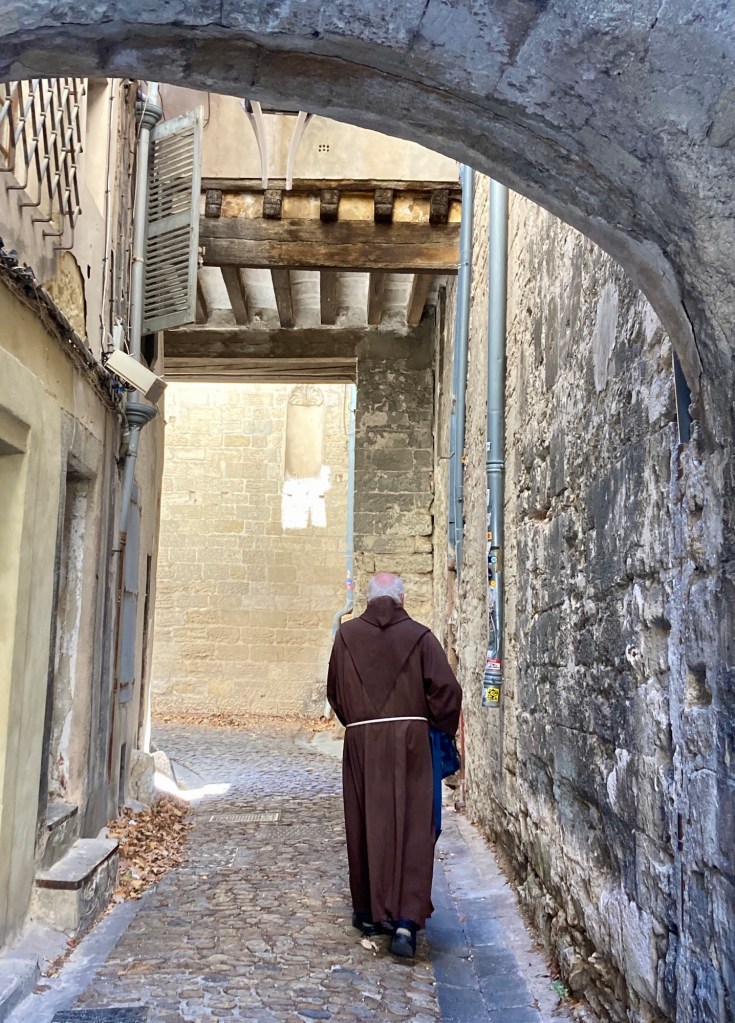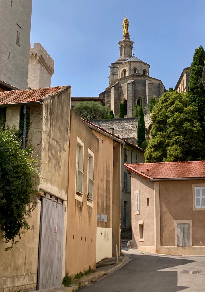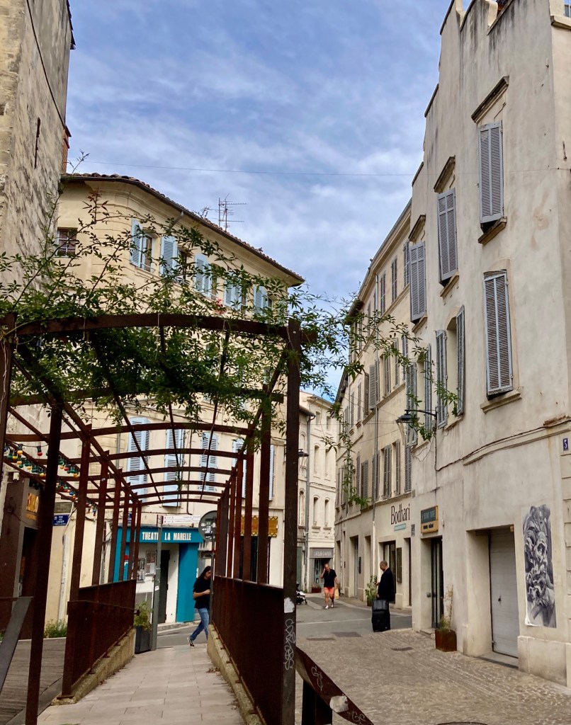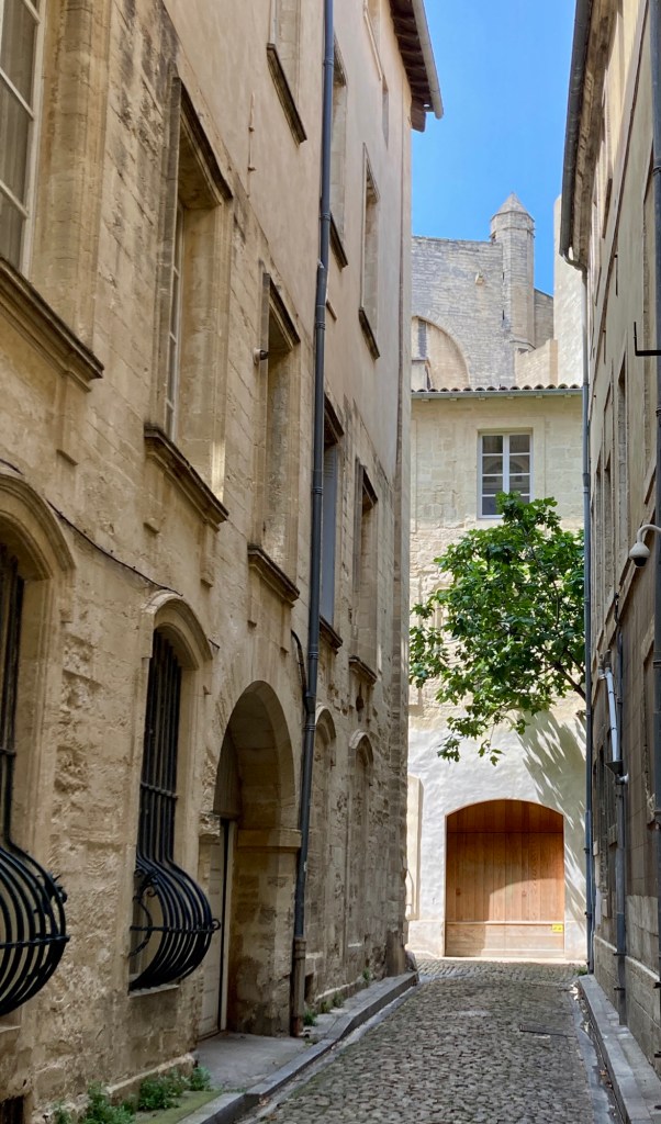 We arrived on August 1st, after visiting various locations in France and Luxembourg. It was hot, really hot, but we needed to go foraging for food. We exited our building, walked a short distance to Rue des Teinturiers, considered the most beautiful street in Avignon, to the closest grocery store. As we turned the corner, we saw a huge crowd just ahead of us. As we approached, a man stopped us and explained that it was a movie shoot. He said go ahead and walk through, but please don’t talk or look to the left. Feeling a bit like Lot’s wife, we made our way through.