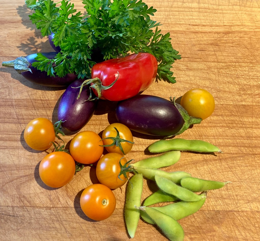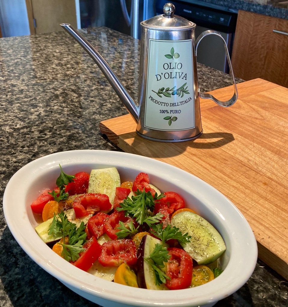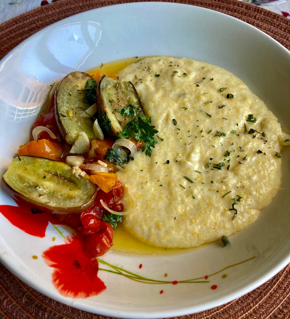 After our ramble earlier this week, we were quite hungry when we got home. We picked a few items from our garden, and theTravelsketcher created this delicious lunch for us; cheesy polenta with roasted tomatoes, aubergine (eggplant) and scallion.
