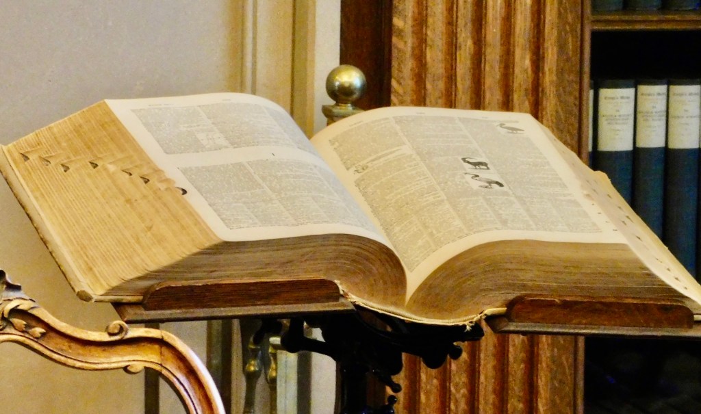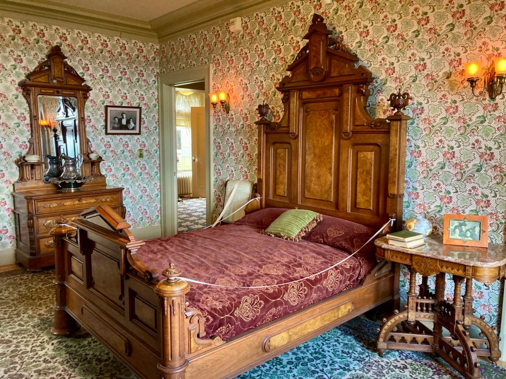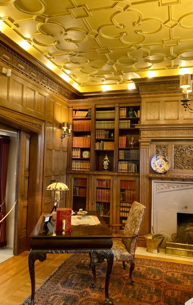 The first room on the tour is the library, where the family gathered after dinner to play games and put puzzles together. It’s modeled in the European style with dark wood and intricate touches.