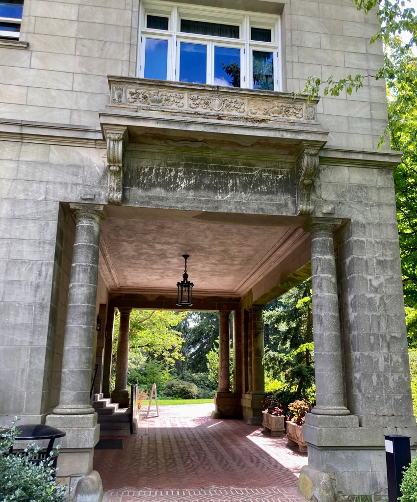 Moving onto the mansion itself; it sits on 46 acres and has sweeping views of the Portland skyline. As I mentioned in last week’s post, it is said that on a clear day you can see five mountains in the Cascade Range; Mounts Rainier, Hood, Adams, St. Helens and Jefferson. (Click here to read about the Big Blast and volcanos in this range). It was overcast on the day we visited so the mountains were elusive.