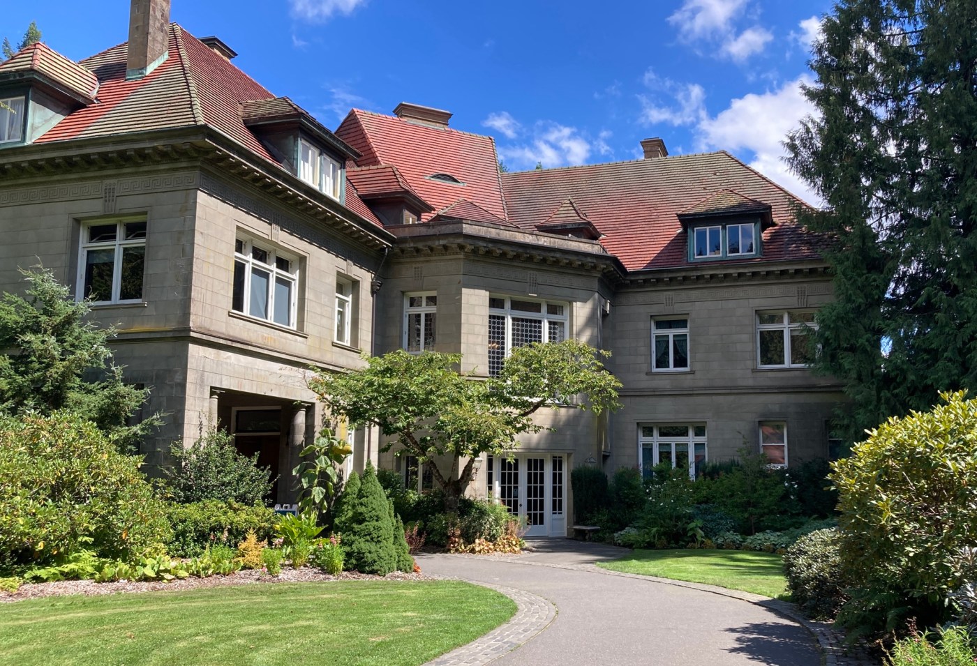 Moving onto the mansion itself; it sits on 46 acres and has sweeping views of the Portland skyline. As I mentioned in last week’s post, it is said that on a clear day you can see five mountains in the Cascade Range; Mounts Rainier, Hood, Adams, St. Helens and Jefferson. (Click here to read about the Big Blast and volcanos in this range). It was overcast on the day we visited so the mountains were elusive.