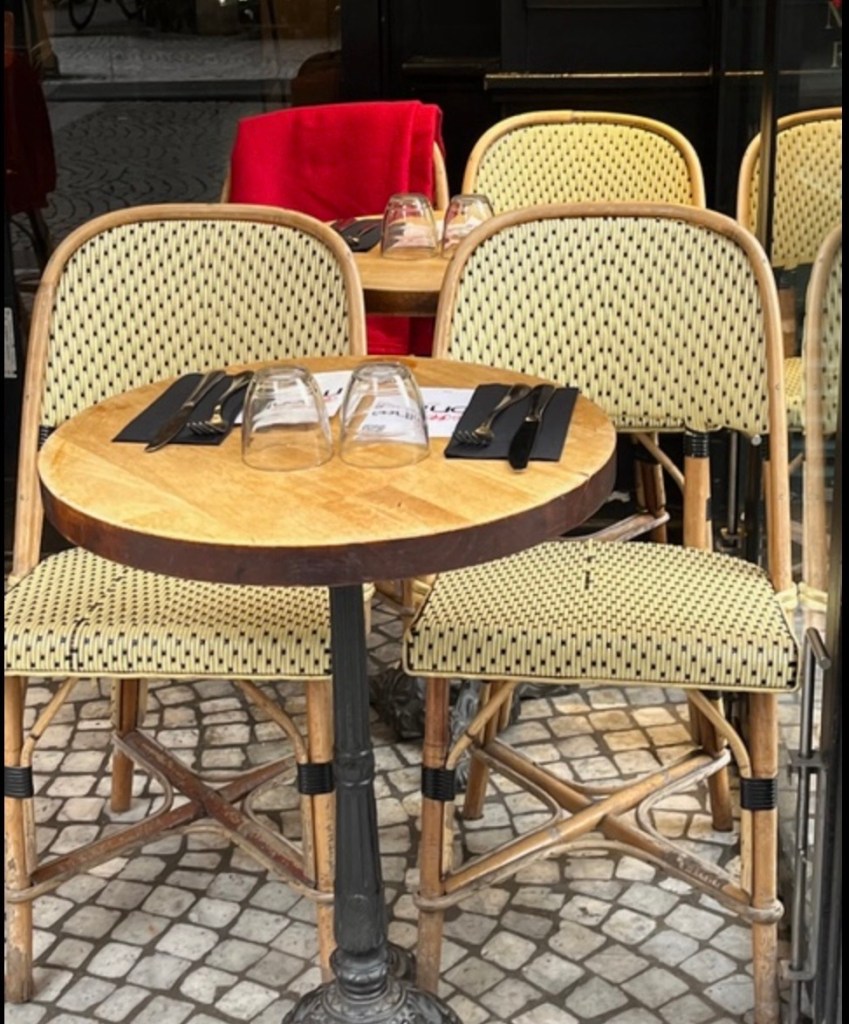 Case in point: Parisian Cafes. Tables placed insanely close together lead to an oft repeated routine: waiter whips small table into even smaller aisle with cooperation of adjoining tables, new diners sidle in to be seated, table is swiftly repositioned and all is normal. While in close proximity, cafe patrons maintain their private space. Conversations are low and rarely overlap—(although visitors from some countries appear oblivious to that; you know who you are…) The endless routine of ‘table in/table out’ organized cafe chaos continues through the day. Departing diners engage in cautiously swift sideways exit from between tables—which are quickly returned to position awaiting the next round.