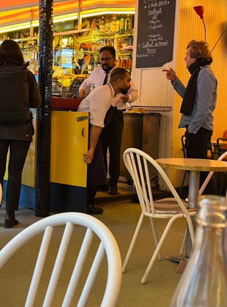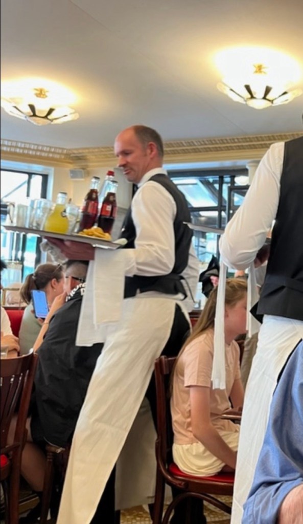 The scene in many Parisian cafes is of narrow aisles and multiple waiters garbed in long white aprons balancing full trays all engaged in a constant ballet-like dance — a show in itself. This constant to-ing and fro-ing of waiters like a group of storks engaged in their mating dance adds to the show as well as contributing to the total congestion of space. There is always something or someone in the way….and yet—it works.