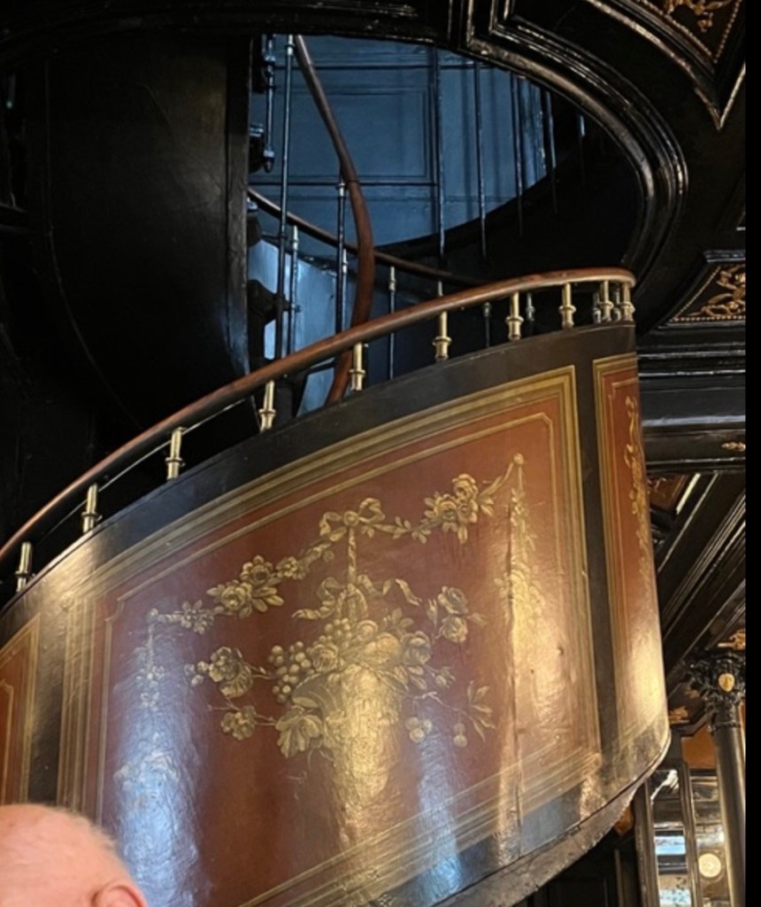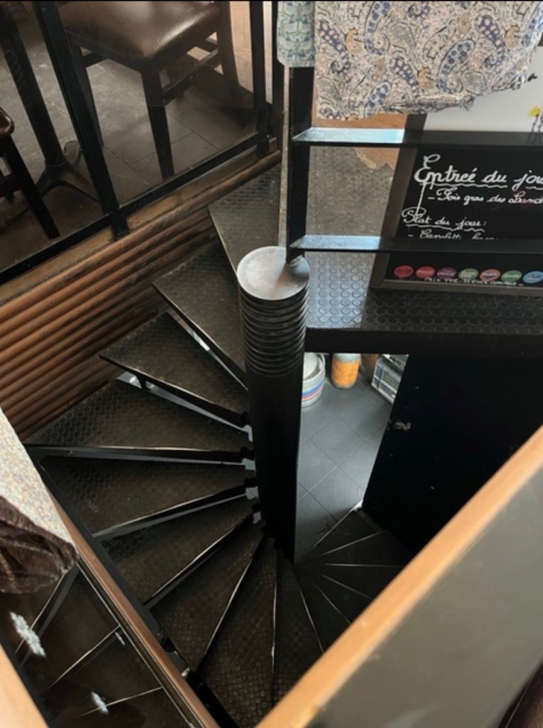Cafe L’Escargot in Montorgueil—an upscale spot that has been around since the early 19th century—also demonstrates optimal use of space. Winding staircases are common in cafes in Paris; sometimes used to seat guests on an upper floor or lead them to Les Toilettes downstairs. However, a very narrow winding staircase in the main dining room at L’Escargot is the route by which kitchen staff take downstairs large boxes of dish-ware or sizable plastic cartons of washed and sterilized escargot (snail) shells. A sight to behold which I have yet to capture on camera is that of a white aproned worker balancing a heavy carton backing his way down the winding staircase. I’ve observed this several times, but these photos of the staircase will have to suffice. I would have to forgo eating and keep my camera in front of my face to capture this deftly executed exit of heavily laden staff backing down the stairs…(I’m not sure I could go down facing forward while holding a banister..!)
