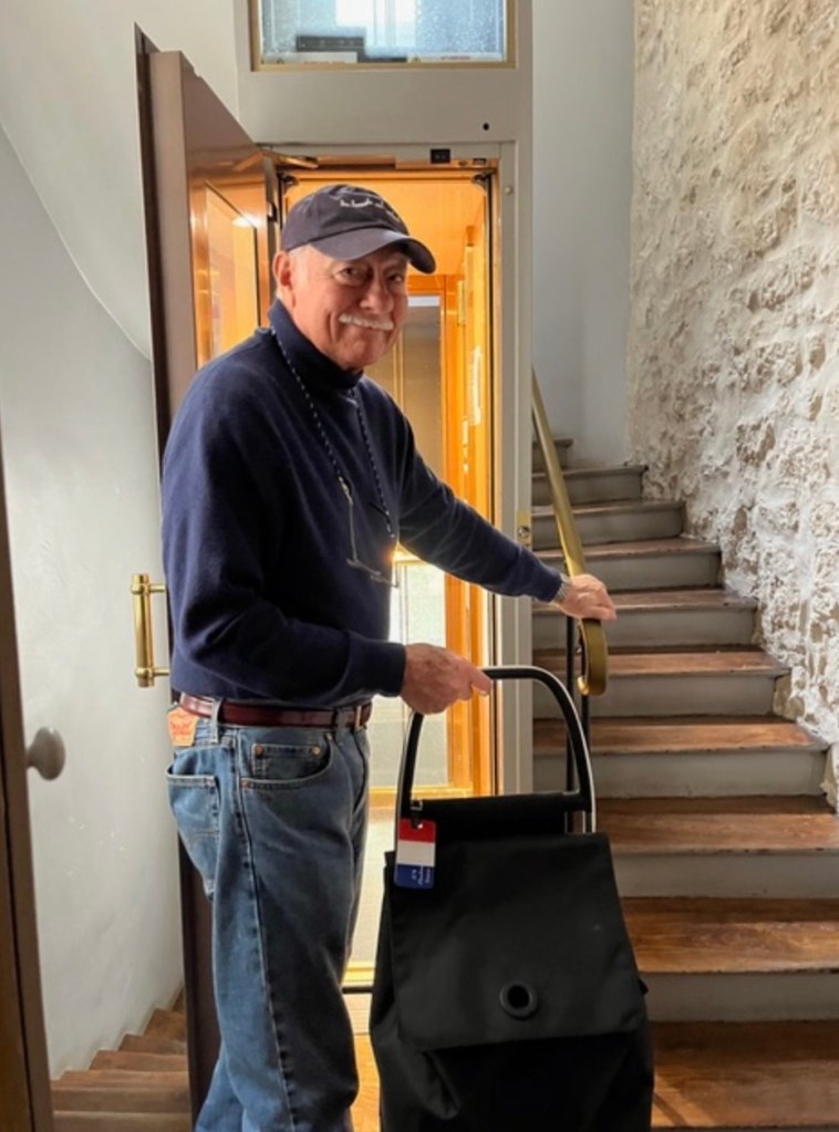 If you observe rules and treat l’ascenseurs with respect, a tiny elevator will take you up and take you down on command. Just don’t push your luck. This is my husband waiting to enter the one patiently waiting outside our apartment door.