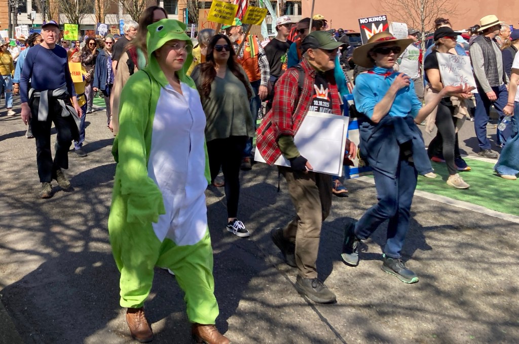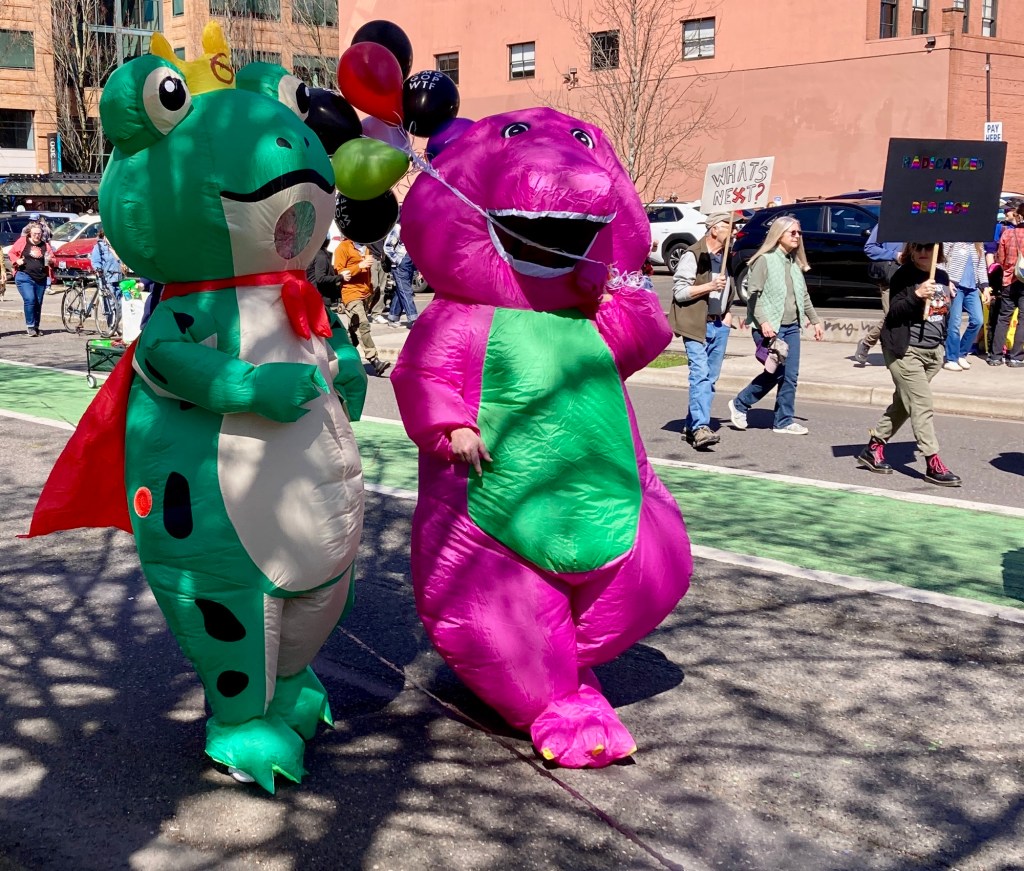 You may have heard about protestors in Portland and across the country, wearing inflatable costumes. This is known as Operation Inflation and originated here in Portland. Their goal is to wear ridiculously silly costumes to deflate the tension between ICE agents and protestors. We saw just a few costumed protestors at this rally.