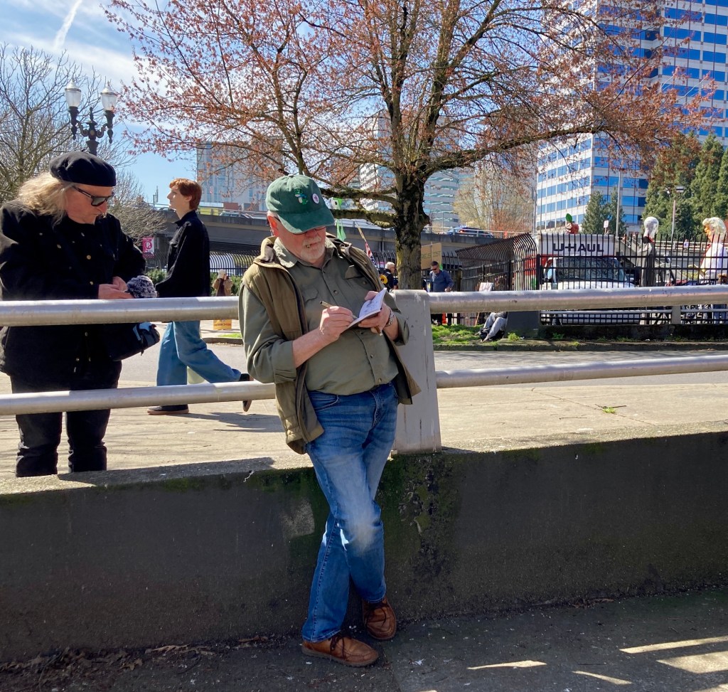 TheTravelsketcher and I were proud to participate in the protest. It was an entirely peaceful and uplifting event. We chatted with so many wonderful people, all equally concerned about the future of our democracy, and so much more, as is shown in the signs.
