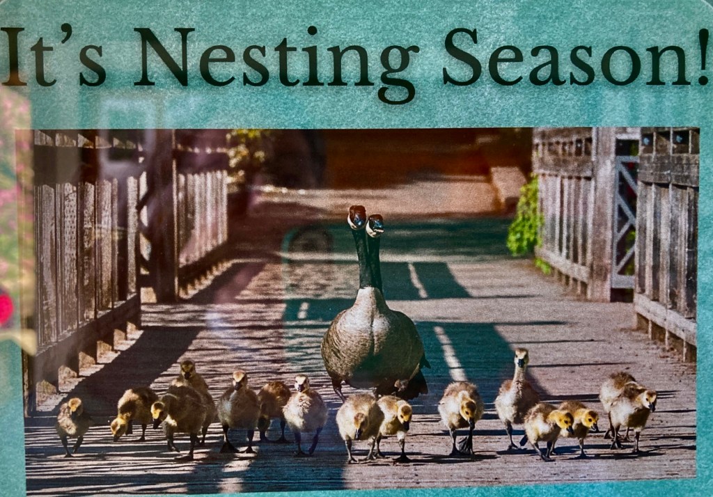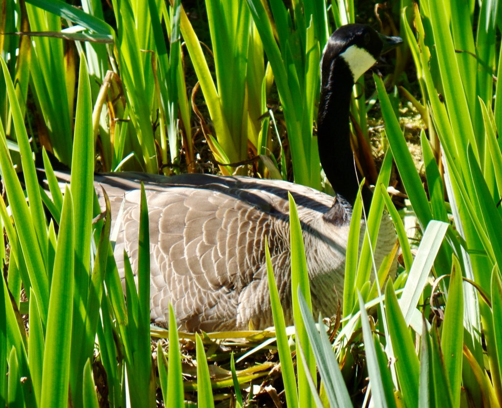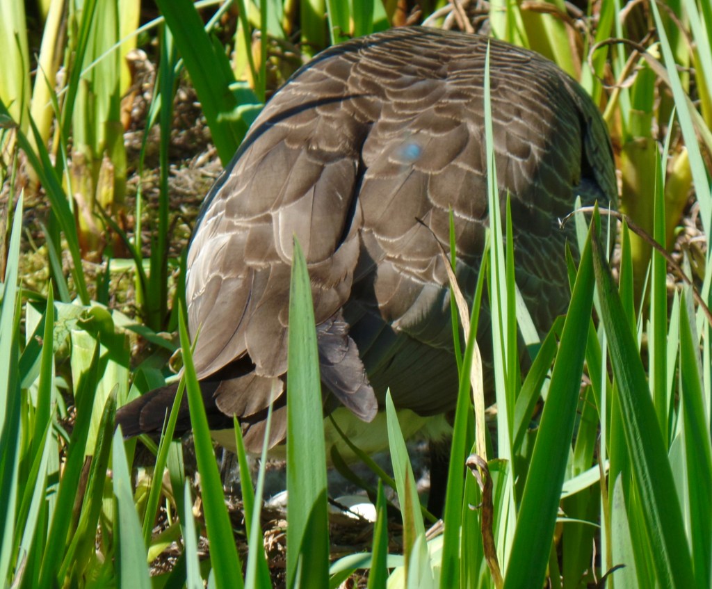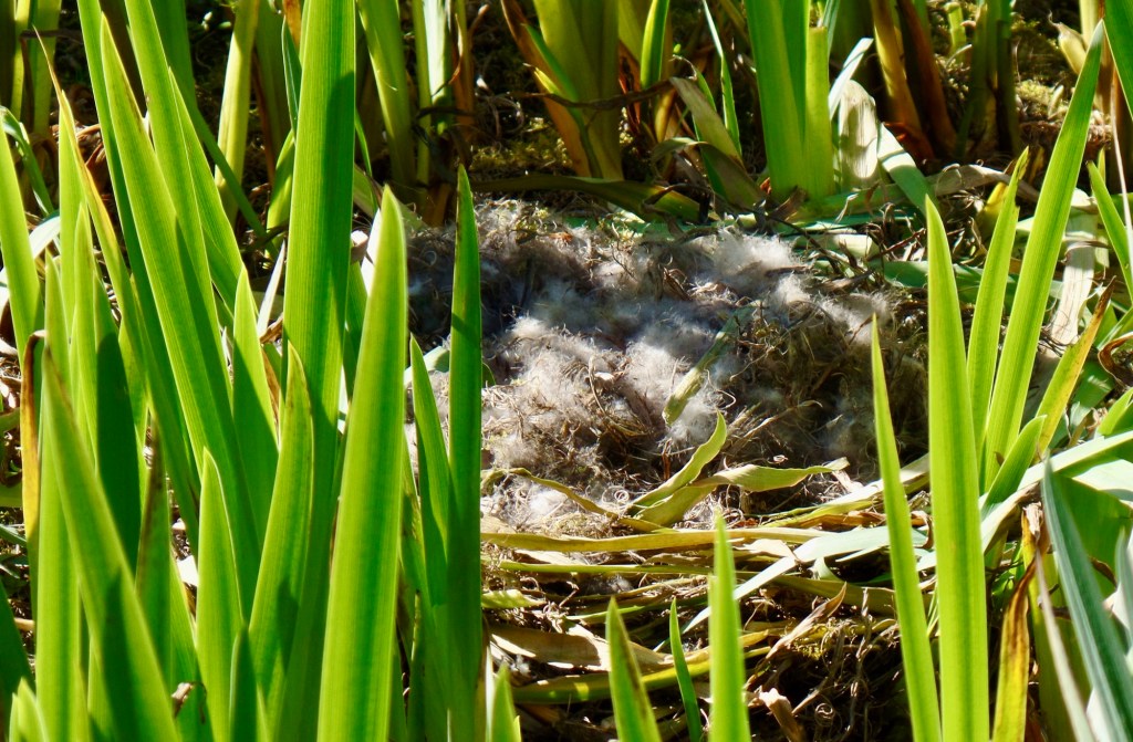 One nest was visible from the bridge; we watched the parental egg warmer for a few minutes before moving on. When we returned a little later, we noticed the adult had left the nest, but covered the eggs with feathers to keep them warm.